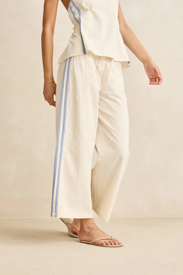 Rhythm. | Designed to pair effortlessly, the Tinker Stripe Pant in Cream features a relaxed fit and elastic waistband for comfort. Contrast binding at the hem lends a refined finish to this breezy staple.